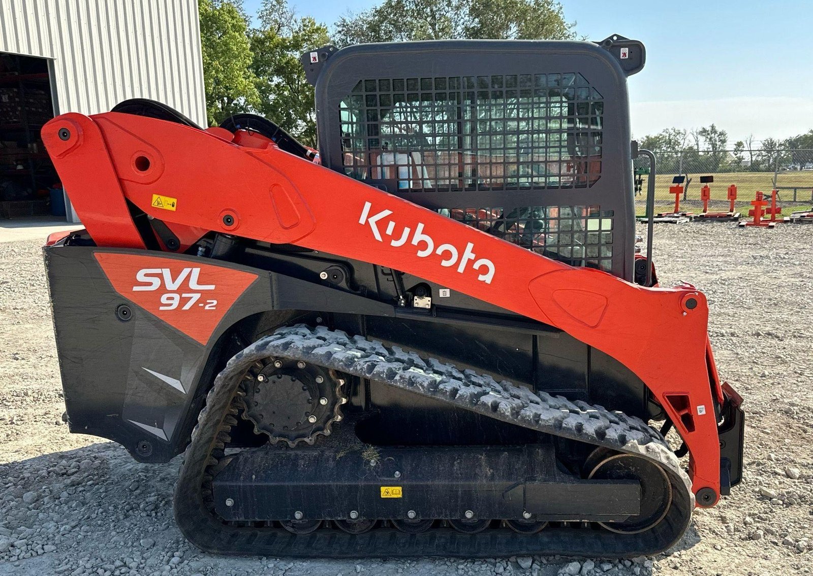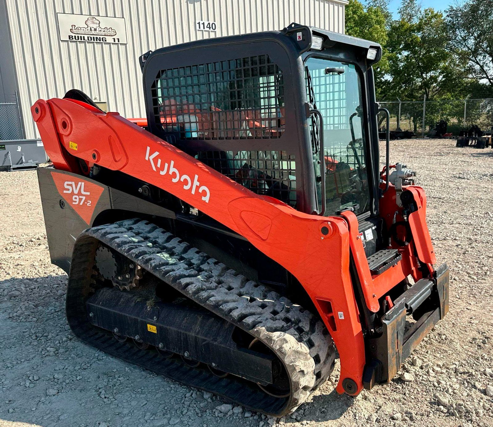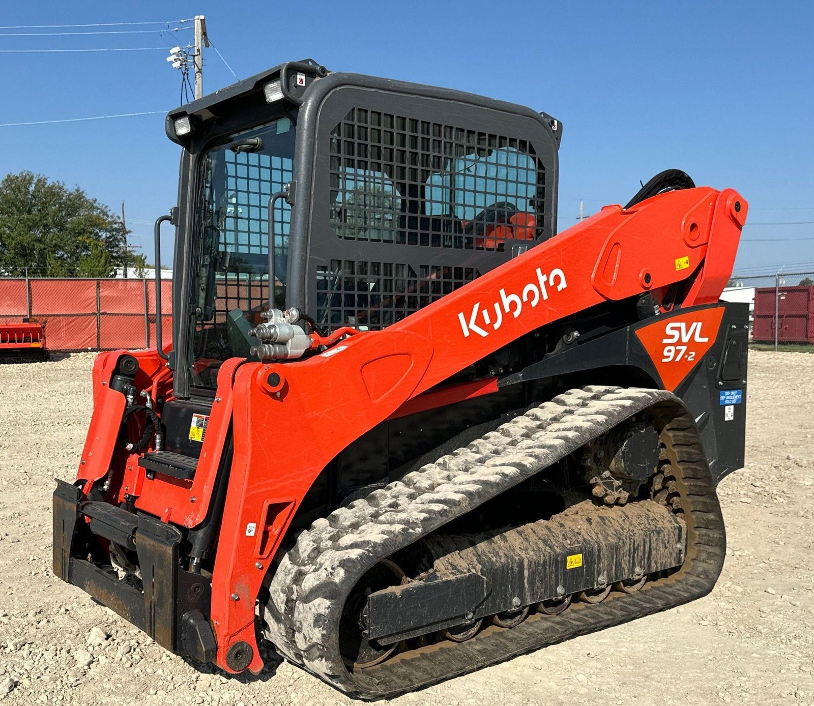 2022 Kubota SVL97-2 Tracked Skid Steer Loader — 3.8L Kubota diesel, two-speed, enclosed cab, hydraulic quick coupler.